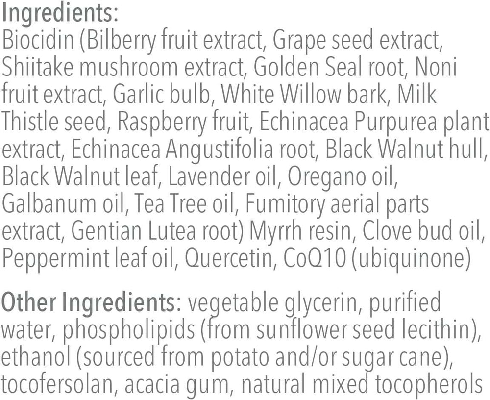 Biocidin (Bilberry fruit extract, Grape seed extract, Shiitake mushroom extract, Golden Seal root, Noni fruit extract, Garlic bulb, White Willow bark, Milk Thistle seed, Raspberry fruit, Echinacea Purpurea plant extract, Echinacea Angustifolia root, Black Walnut hull, Black Walnut leaf, Lavender oil, Oregano oil, Galbanum oil, Tea Tree oil, Fumitory aerial parts extract, Gentian Lutea root) Myrrh resin, Clove bud oil, Peppermint leaf oil, Quercetin, CoQ10 (ubiquinone) Other Ingredients: vegetable glycerin, purified water, phospholipids (from sunflower seed lecithin), ethanol (sourced from potato and/or sugar cane), tocofersolan, acacia gum, natural mixed tocopherols