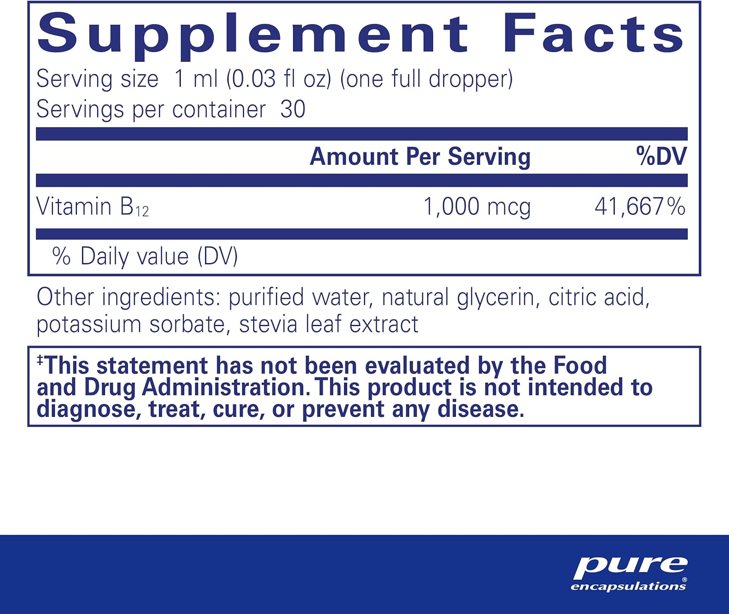 Pure Encapsulations B12 Liquid delivers 1,000 mcg of methylcobalamin, a bioavailable form of vitamin B12 designed to help support nerve health, energy production, and immune system balance. This easy-to-use liquid formula is ideal for individuals seeking a convenient way to maintain daily B12 intake.