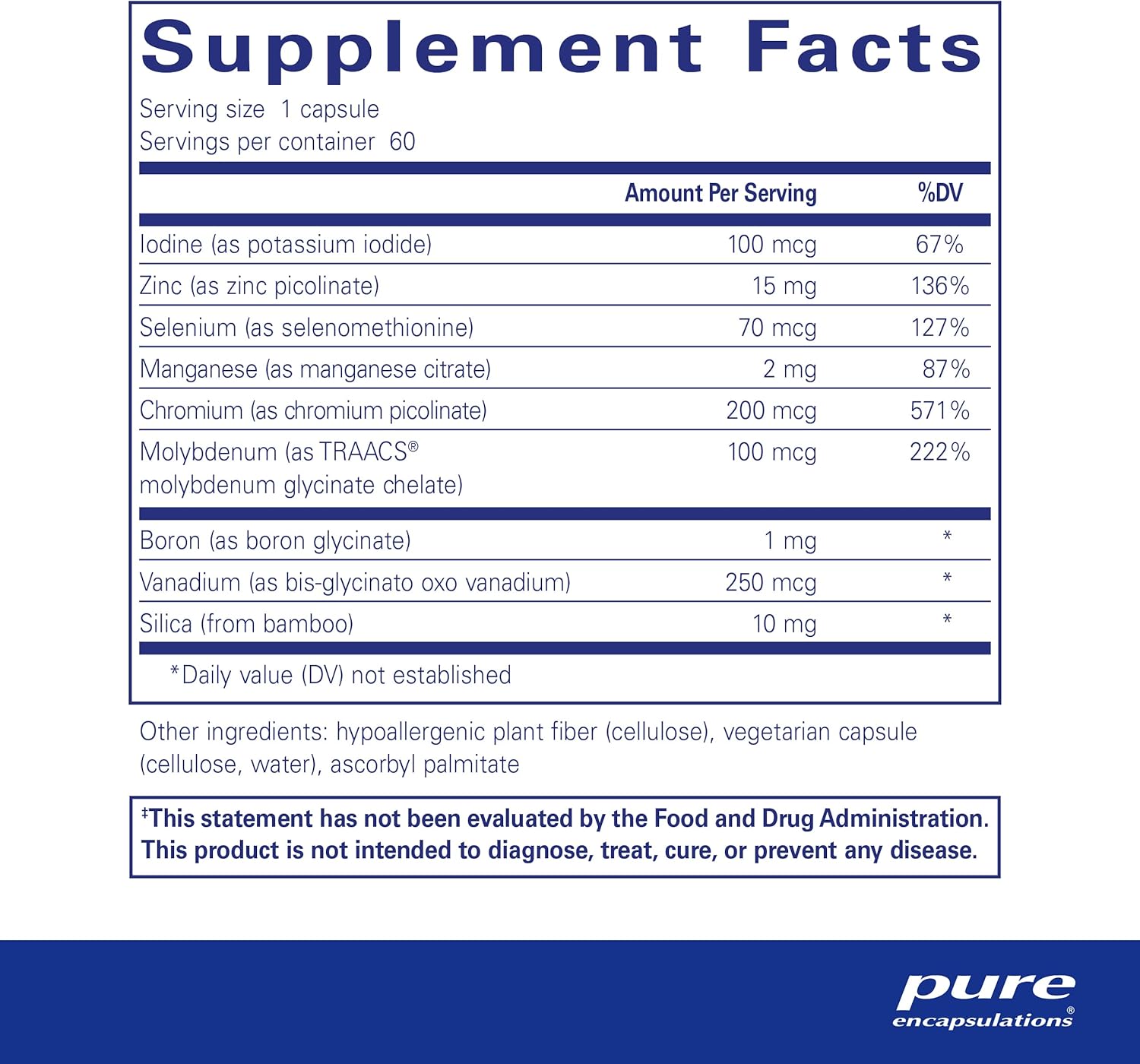 Pure Encapsulations Trace Minerals is a premium multimineral supplement designed to support metabolism and cellular function. This vegan-friendly formula delivers a balanced blend of essential trace minerals including iodine, zinc, selenium, manganese, chromium, molybdenum, boron, and vanadium.