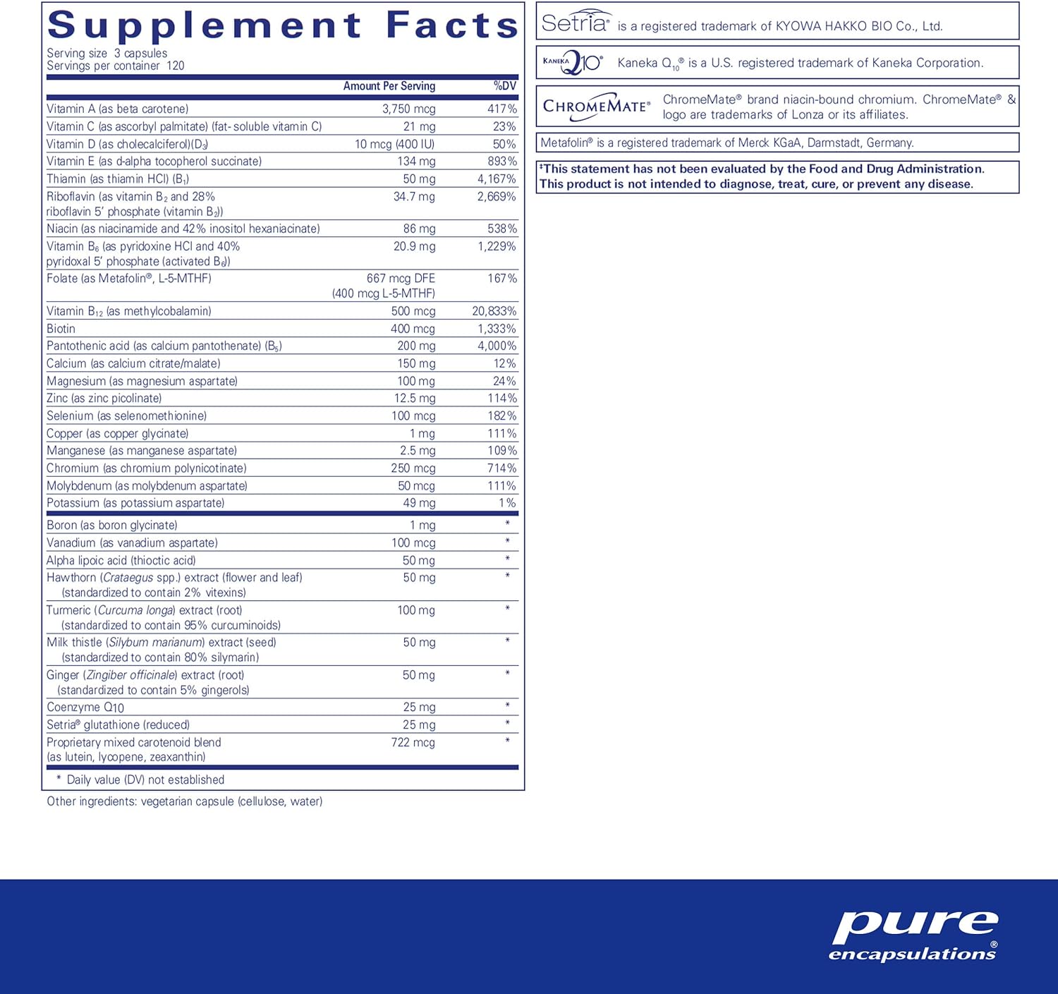 Pure Encapsulations UltraNutrient is a comprehensive multivitamin and mineral supplement formulated to help support cardiovascular and liver health. This iron-free blend includes highly bioavailable nutrients such as Metafolin L-5-MTHF, vitamin A, vitamin D3, riboflavin, and copper to aid nutrient absorption and metabolic function.