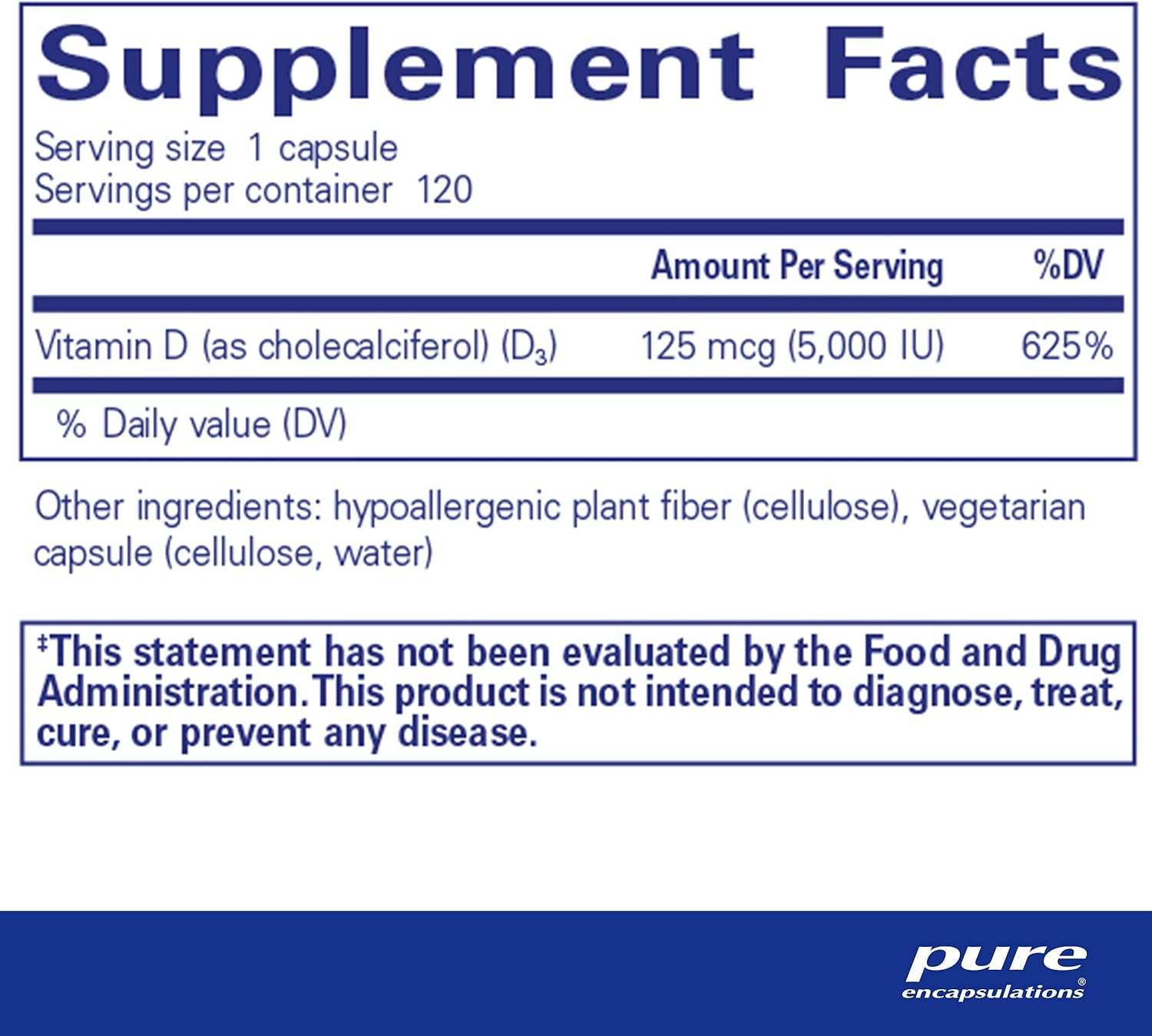 Pure Encapsulations Vitamin D3 5000 IU 125 mcg Bone Immune Heart Support 120 Caps