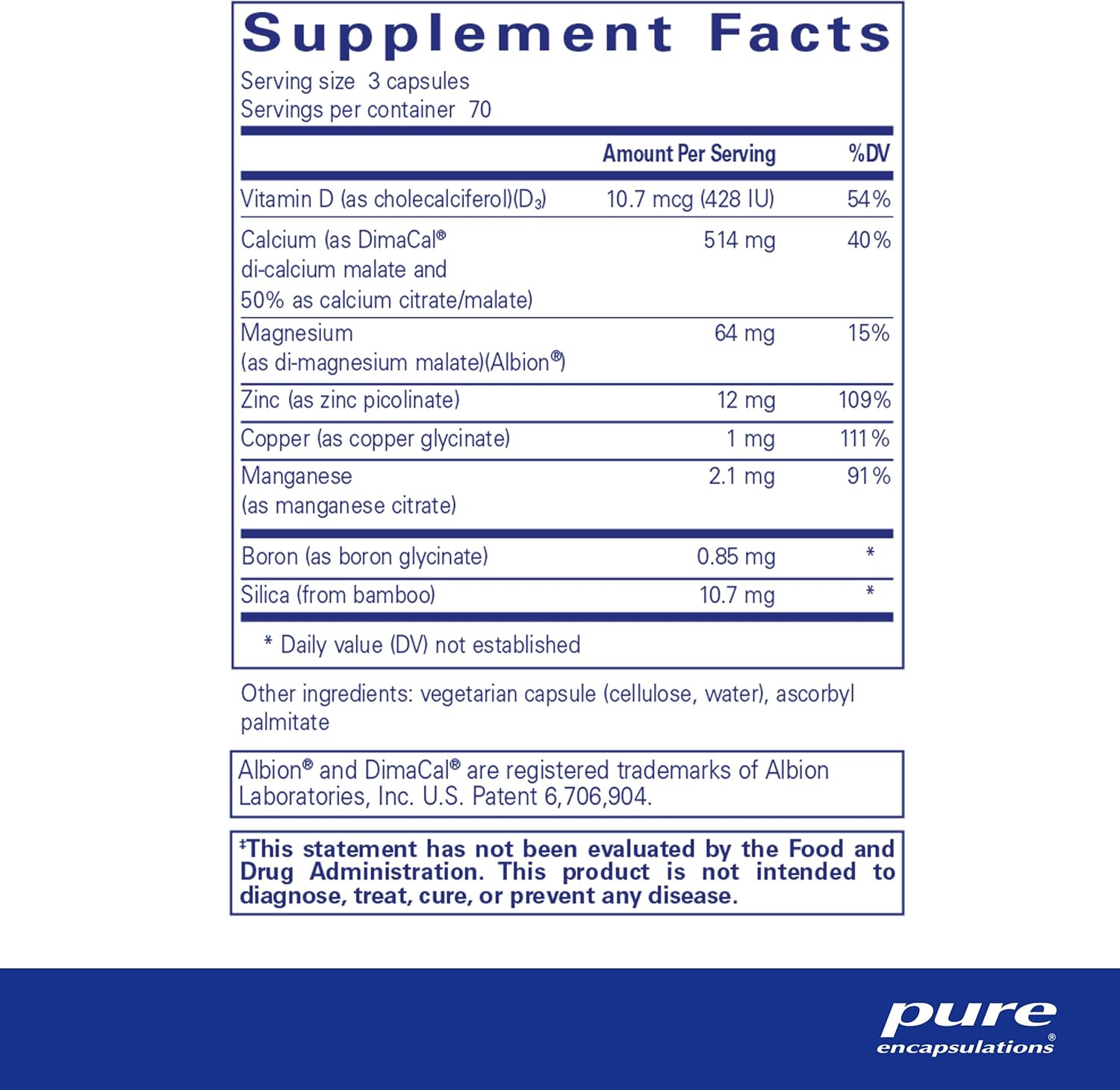 Pure Encapsulations OsteoBalance is a comprehensive calcium supplement designed to help support bone mineralization and calcium absorption. Each serving delivers 514 mg of calcium sourced from calcium citrate/malate and calcium malate, along with a synergistic blend of essential nutrients including vitamin D, magnesium, zinc, copper, manganese, boron, and silica.