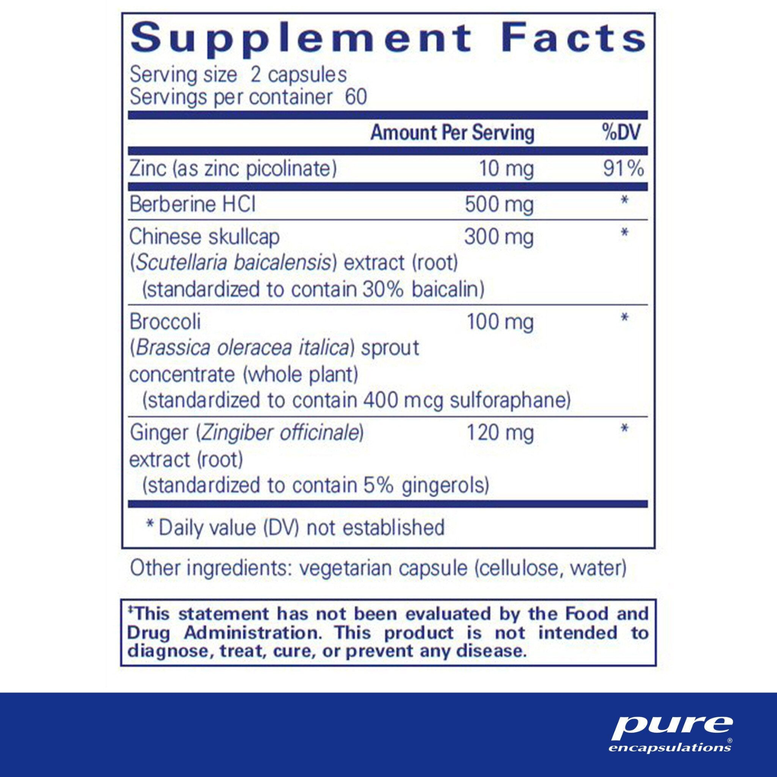 Ingredients Berberine HCl, baicalin (from Chinese skullcap), sulforaphane (from broccoli seed extract), ginger extract, zinc (as zinc citrate), hypoallergenic plant fiber (cellulose), vegetarian capsule (cellulose, water)