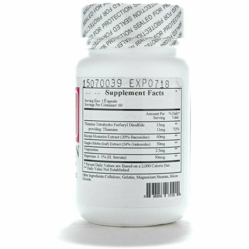 Contiene una mezcla de extractos de hierbas estandarizados, que incluyen Bacopa Monniera (60 mg), Ginkgo Biloba (50 mg), tiamina (15 mg) y huperzina A (50 mcg).