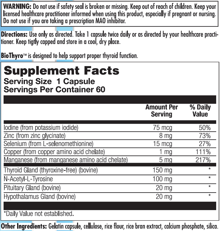 1 capsule: Iodine (potassium iodide) 75 mcg Zinc (glycinate) 7.5 mg Selenium (selenomethionine) 15 mcg Copper (glycinate) 1 mg Manganese (aspartate) 4.5 mg Thyroid 150 mg N-acetyl L-tyrosine 100 mg Pituitary 20 mg Hypothalamus 20 mg Other ingredients: Gelatin, dicalcium phosphate, cellulose, magnesium stearate, silica.
