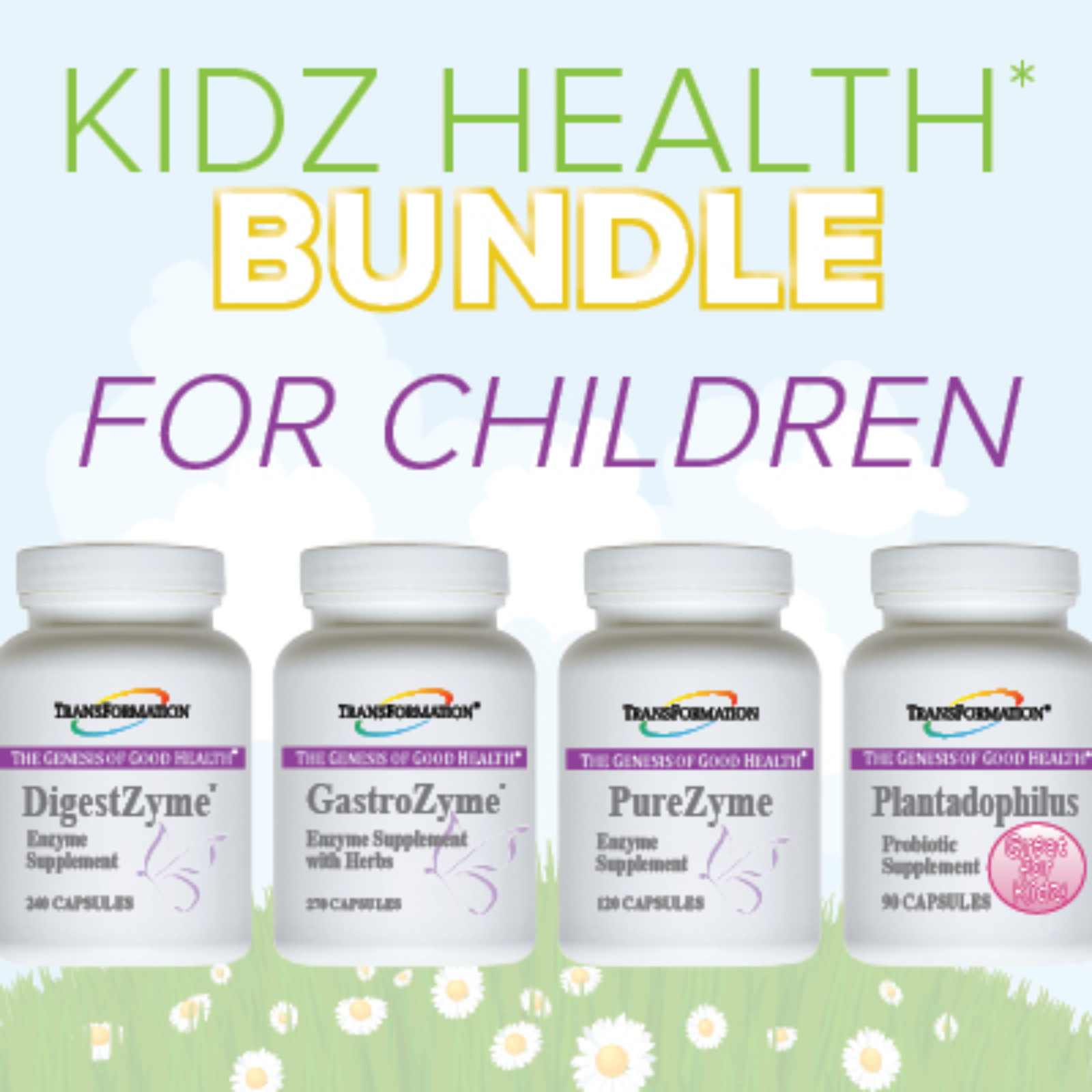 Transformation’s Kidz Health Bundle for Children includes DigestZyme (240 caps), GastroZyme (270 caps), PureZyme (120 caps), and Plantadophilus (90 caps).