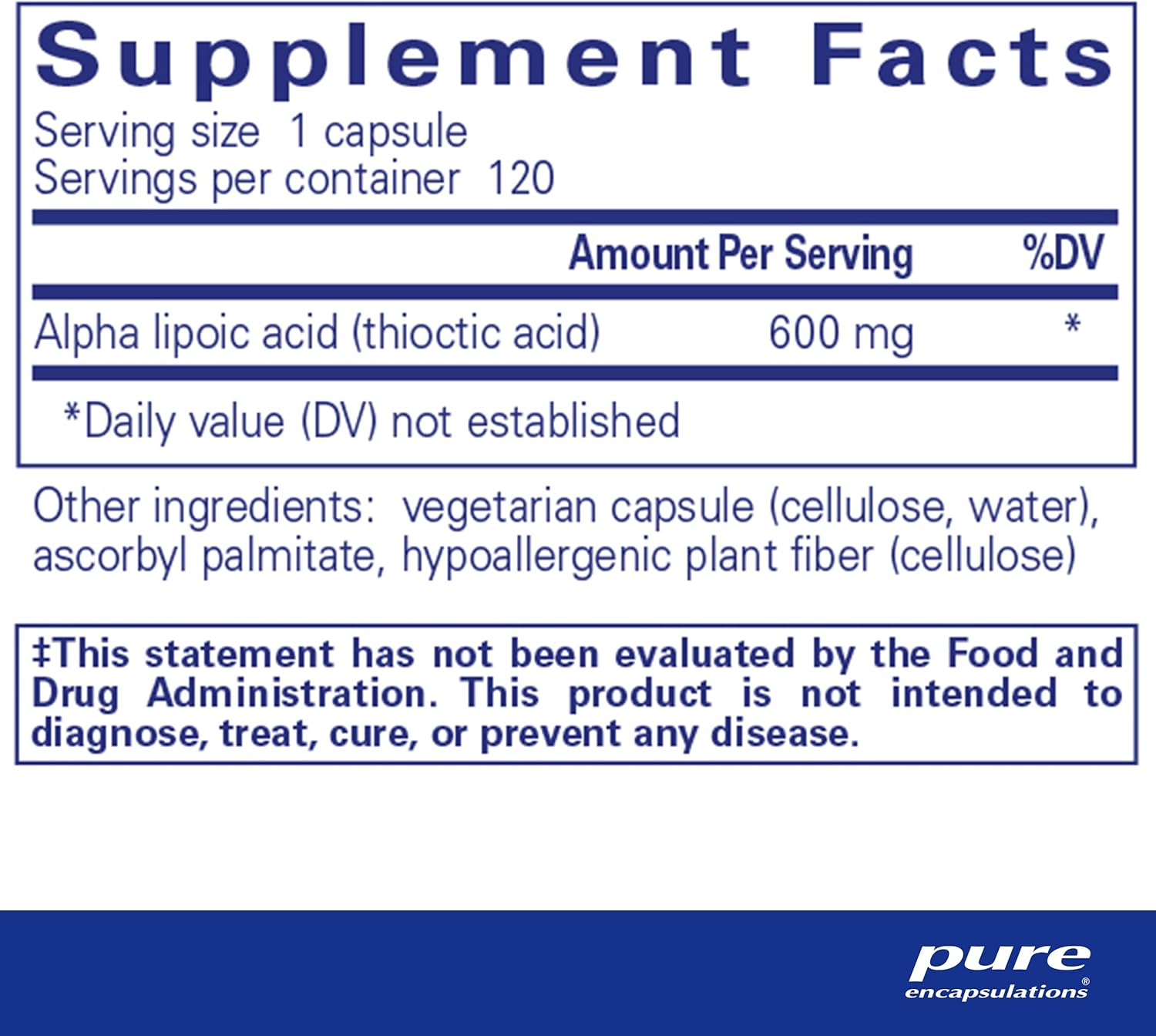 Pure Encapsulations Alpha Lipoic Acid 600 mg delivers premium antioxidant support to help maintain cellular health and metabolic balance. This supplement is formulated to aid healthy nerve function and support carbohydrate metabolism. Each capsule is crafted with high-quality ingredients and undergoes rigorous testing to ensure purity and potency.